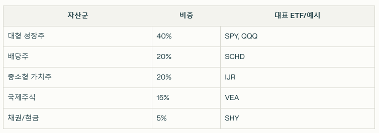 본인 성향과 시장 전망에 맞게 비중 조정 - 예시: 대형 성장주 40%, 배당주 20%, 중소형 가치주 20%, 국제주식 15%, 채권/현금 5%