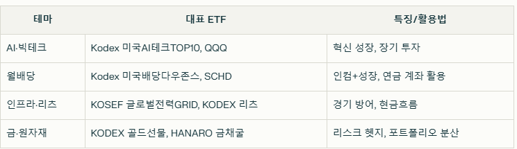 • AI, 미국 강세장, 반도체, 월배당, 인프라, 금·은, 리츠 등