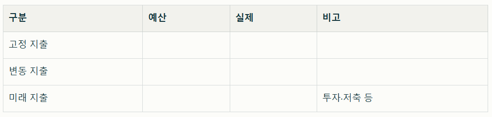 - 미래 지출: 비상자금, 투자, 연금, 교육비 등